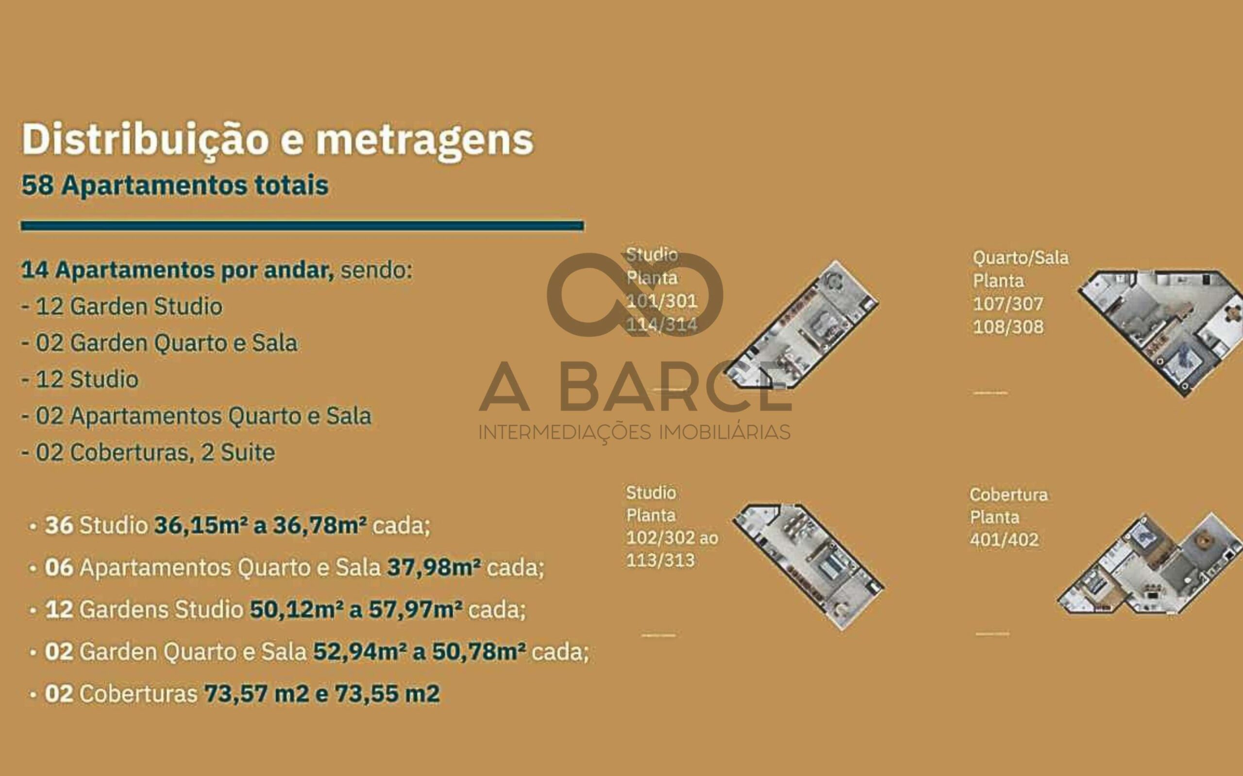 – 12 Garden Studios – Metragem: 50,12 m² a 57,97 m²;