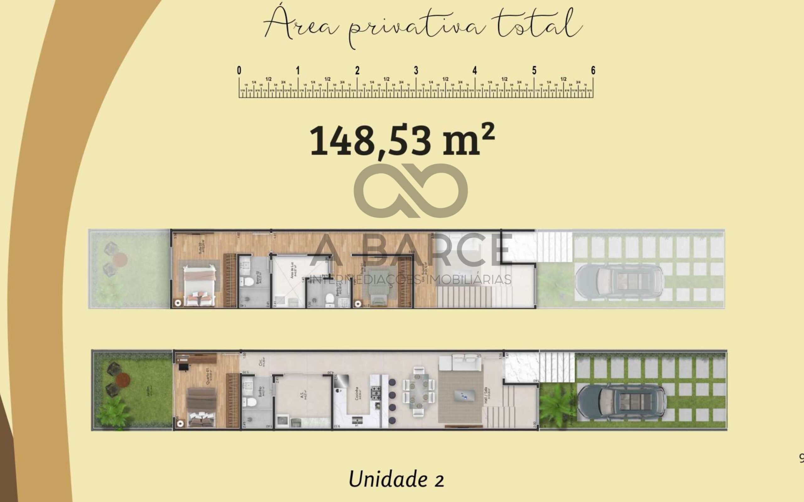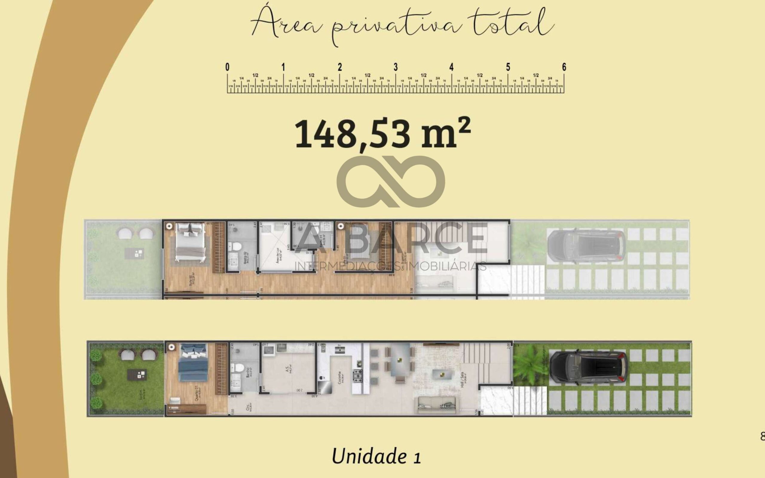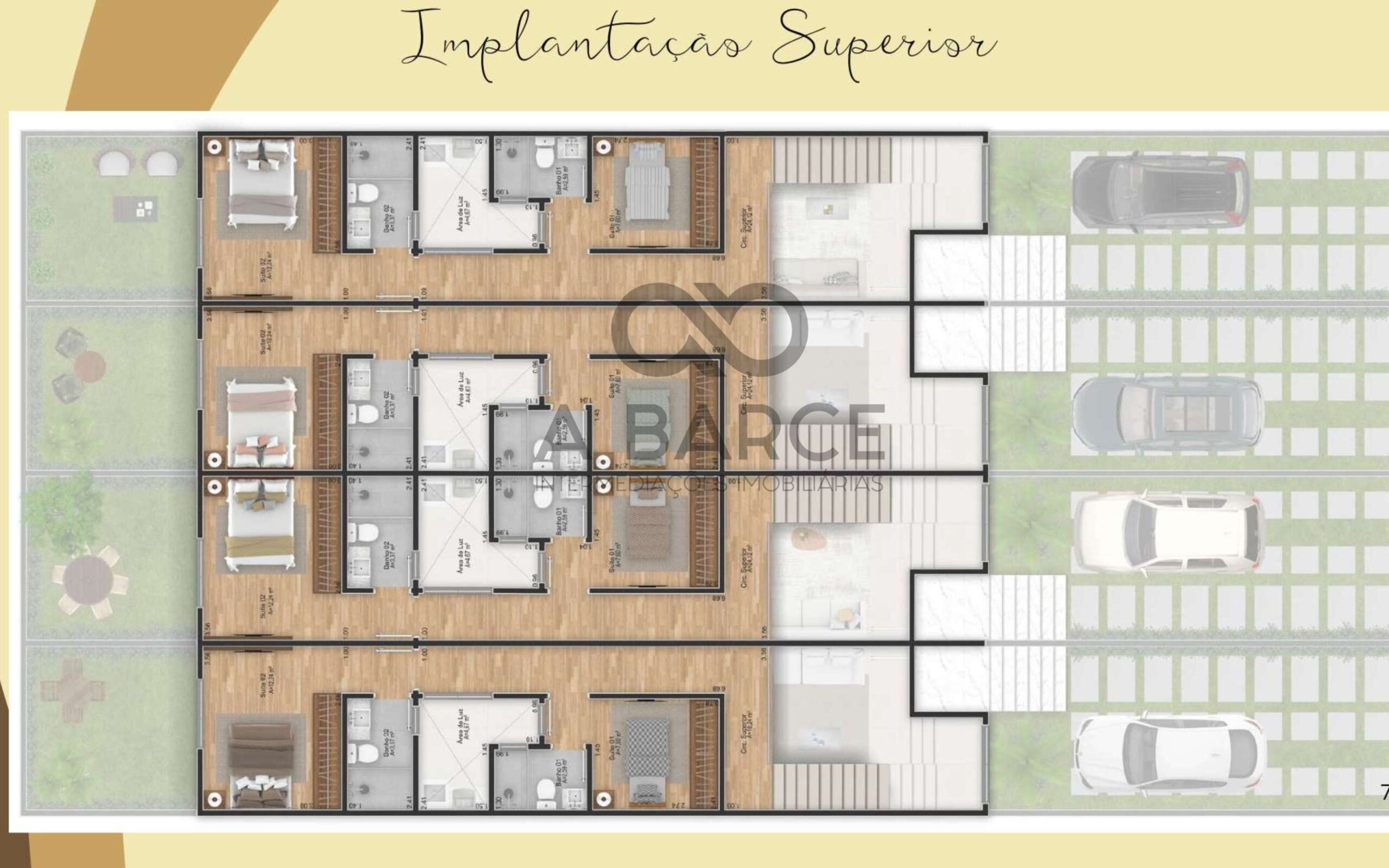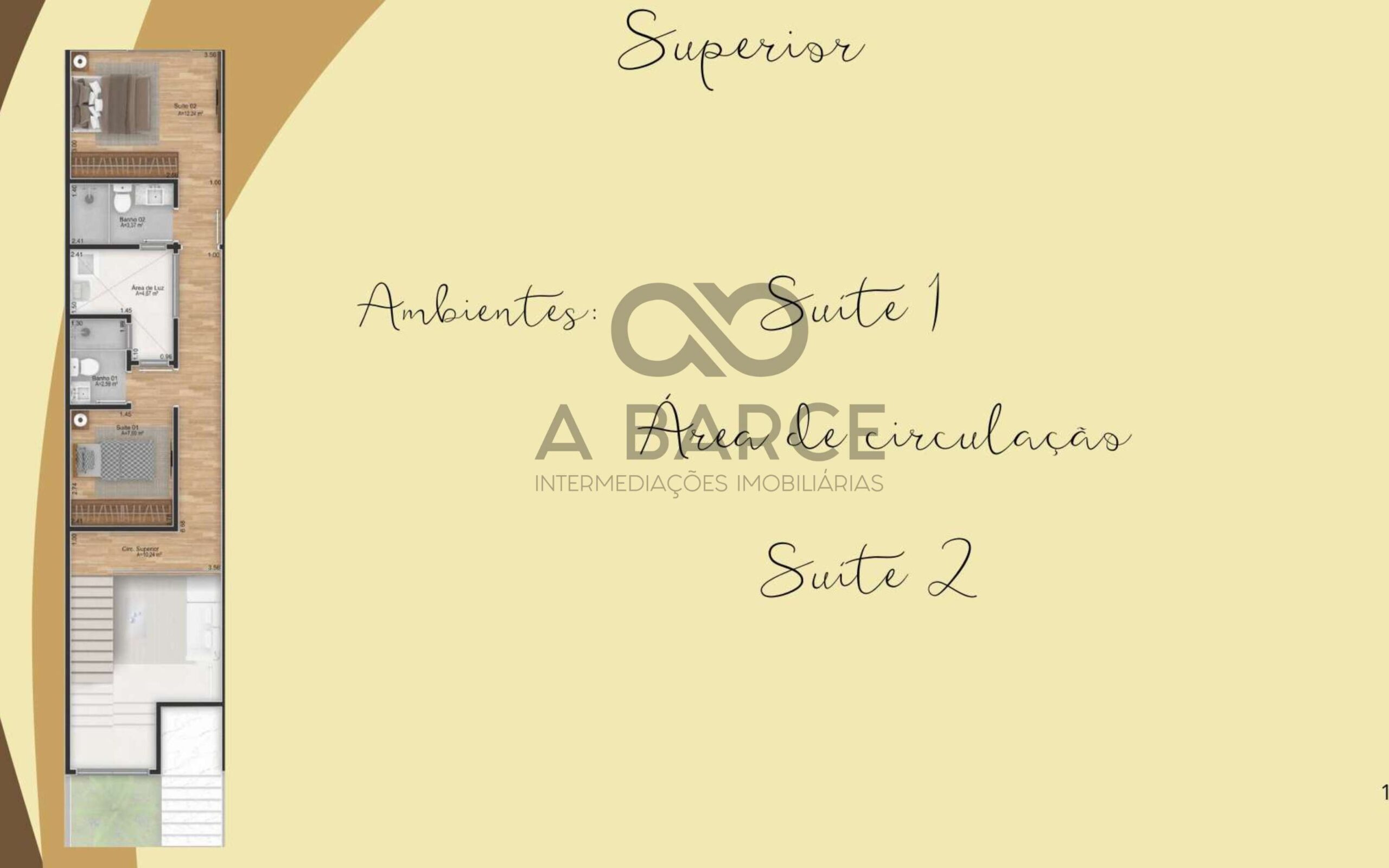 Unidades individuais com pavimento superior inseridas duas suítes e área de circulação.