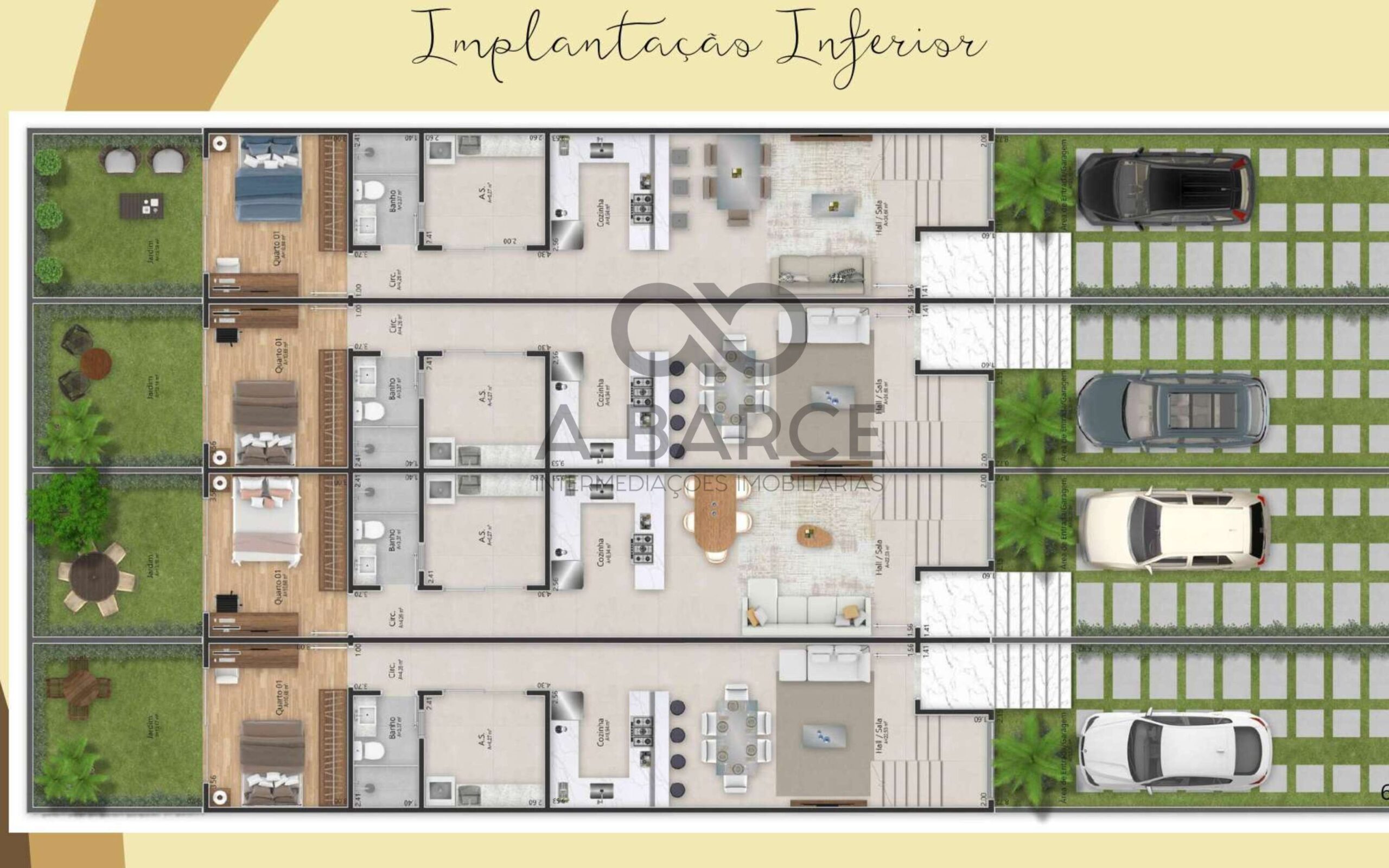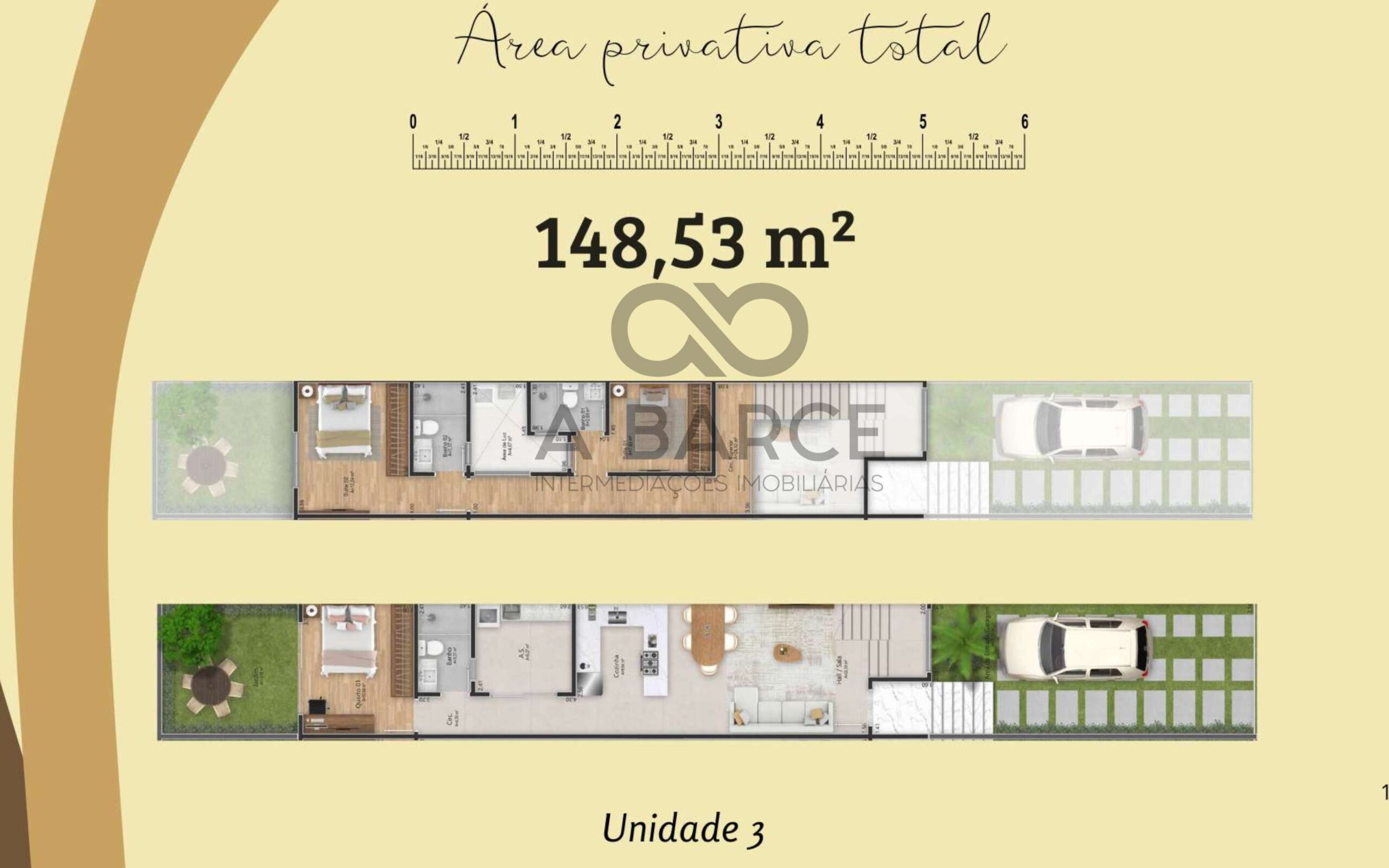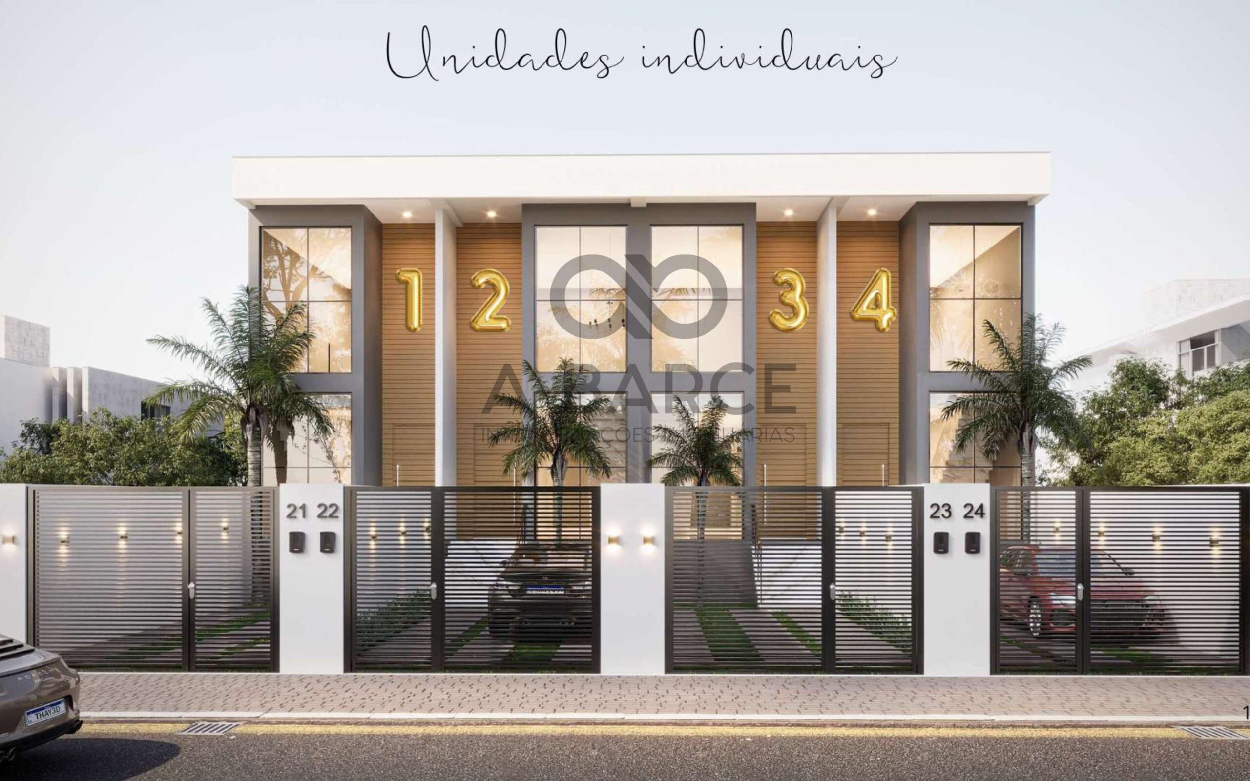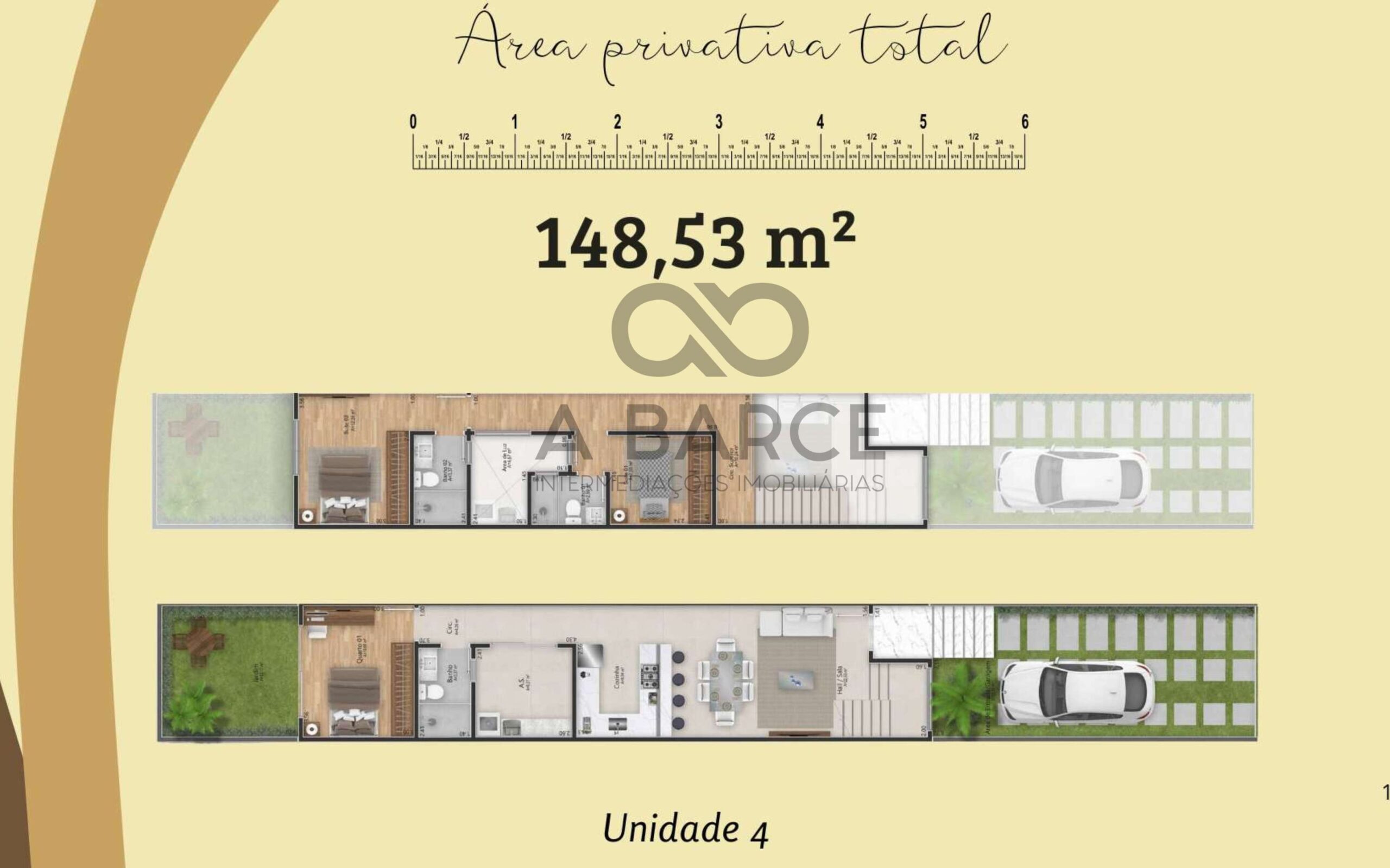 Unidades individuais com pavimento superior inseridas duas suítes e área de circulação.